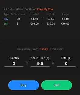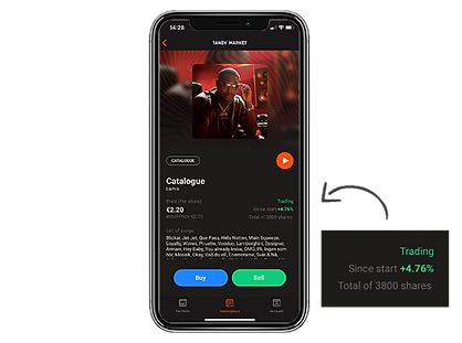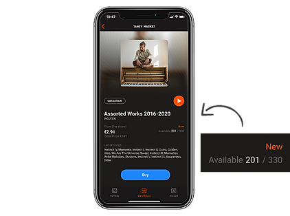 Scrolling down on every music asset in ‘Trading’, you will find the order depth. This is where you see the available Buy and Sell orders. Place your order to match another order on the market. The market uses a queue system, first one in line get’s the share. You find all your pending orders in Portfolio > Orders.