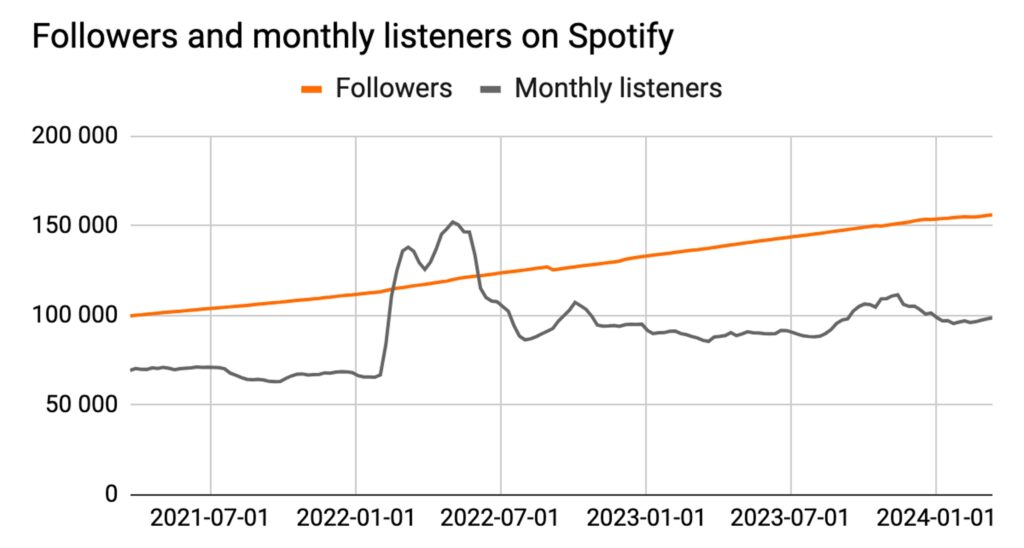 In the chart above you can spot an upward trend for Watain’s followers (orange) and monthly listeners (grey) on Spotify. At the moment, Watain has close to 100 000 listeners a month and almost 160 000 followers on Spotify.