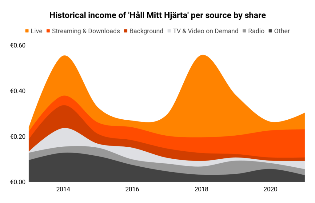 The graph below shows the historical income of ‘Håll Mitt Hjärta’ from performance revenue (songwriter’s royalties). The peaks in live revenue might just correlate with Björn Skifs’ national tours as his version of ‘Håll Mitt Hjärta’ is often occurring on his set lists.